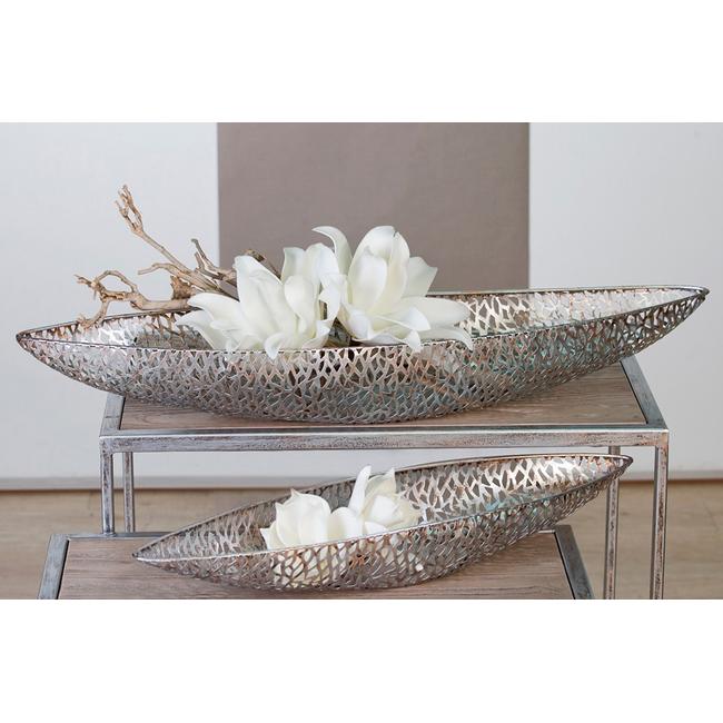 Die moderne Wohnraumdekoration ist sehr beliebt und wird gern mit anderen passenden Wohnraumaccessoires der Kollektion „Purley“ kombiniert. Die Deko-Schale ist aus Metall und kann wunderschön dekoriert werden. Es gibt viele Dekorationsideen, die mit der Purley-Serie kreiert werden können. Zum Beispiel kann die schöne Schale in Schiffchenform mit einer Dekoblume dekoriert werden. Das sieht toll aus und schafft Ambiente. Die Kollektion „Purley“ ist filigran gearbeitet und in Antikfinish Silber für das moderne Interieur gedacht. Die Oberfläche wird mit Bürst- und Wischtechnik von Hand bearbeitet. Die Wohnaccessoires aus Metall wurden von der Australierin Jennifer Dumet kreiert.