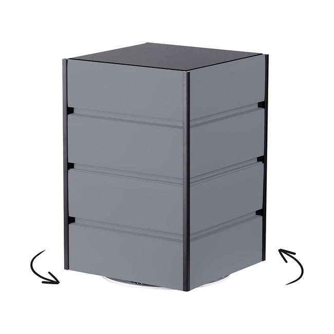Dieser 4-seitige Lamellenwand-Tischtower verwandelt Ihre Ladentheke in eine stilvolle Präsentationsfläche, die Ihren Produkten die Aufmerksamkeit der Kunden sichert. Das eingebaute Drehelement inklusive Kratzschutz eröffnet eine Rundum-Ansicht, die Ihre Artikel aus jedem Blickwinkel optimal zur Geltung bringt. Die Farbauswahl der Lamellenwandprofile ermöglicht eine harmonische Integration in Ihr Shopkonzept.