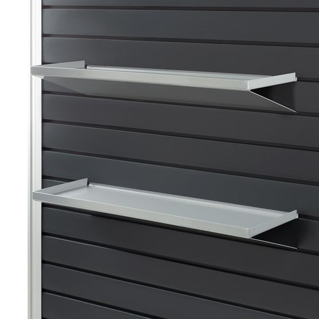 Ablagetablett aus pulverbeschichtetem Stahlblech für erhöhte Gewichtsbelastung. Durch die zusätzliche Abstützung in der nächsten Nut des FlexiSlot-Profils ermöglicht Ihnen diese Ablage die Präsentation von Produkten oder Informationsmaterialien mit erhöhtem Gewicht.