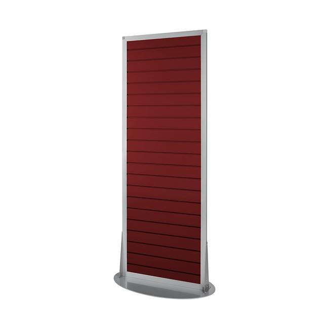 Dieses formschöne Lamellenwand-Display bietet 2-seitig Fläche zur Präsentation Ihrer Produkte oder Informationsmaterialien. Durch die Gesamthöhe von 1.600 mm bleibt die Durchsicht im Verkaufsraum bestehen. Stabilität erlangt das Display durch eine ellipsenförmige Stahlfußplatte. Diese wird in Kombination mit den Stabilisierungsstreben an das silber eloxierte Rahmenprofil des Oberteils geschraubt.