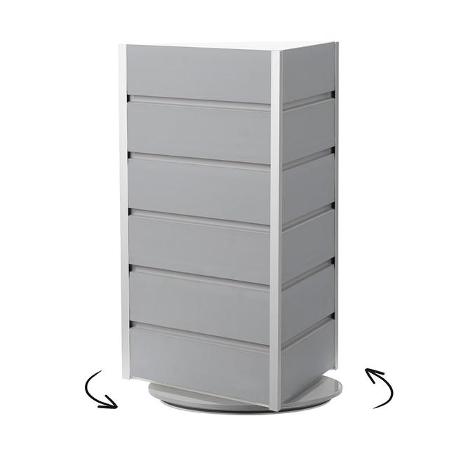 Dieser Lamellenwand-Tischtower macht Ihre Ladentheke zu einem visuellen Highlight und zieht durch den dreiseitigen Aufbau gezielt Blicke an. Mit einem Drehelement inklusive Kratzschutz ausgestattet, gewährleistet er eine mühelose und langlebige Nutzung. Dank der vielfältigen Farbgebungsmöglichkeiten der Lamellenwandprofile lässt sich der Tischaufsteller in jede bestehende Shopeinrichtung integrieren.