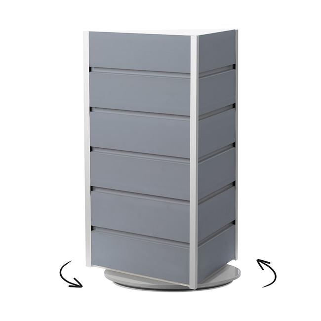 Dieser Lamellenwand-Tischtower macht Ihre Ladentheke zu einem visuellen Highlight und zieht durch den dreiseitigen Aufbau gezielt Blicke an. Mit einem Drehelement inklusive Kratzschutz ausgestattet, gewährleistet er eine mühelose und langlebige Nutzung. Dank der vielfältigen Farbgebungsmöglichkeiten der Lamellenwandprofile lässt sich der Tischaufsteller in jede bestehende Shopeinrichtung integrieren.