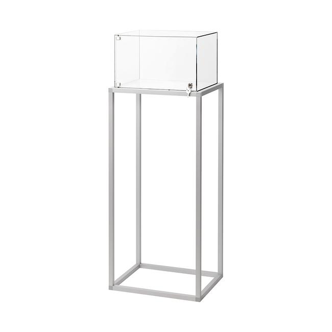 Die Bestandteile dieses Displays werden im montierten Zustand geliefert, sodass zum Einsatz lediglich die Vitrine mit einer Zwischenplatte auf das Gestell aufgesetzt wird.