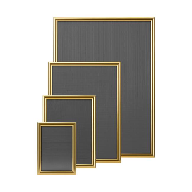 Dieser Posterrahmen zeichnet sich durch seine hochwertige Verarbeitung und sein in goldoptik gehaltenes Oberprofil aus. Durch das elegante Profil fügt sich dieser Rahmen jederzeit harmonisch in die Umgebung des Einsatzortes ein. Die verwendeten Abdeckfolien sind aus entspiegeltem, UV-stabilisiertem Material gefertigt, wodurch das Ausbleichen der Plakate verhindert wird. Weiterhin sorgt die Entspiegelung der Folien - selbst bei Sonnenlicht - für eine deutlich bessere Lesbarkeit der Einleger. Die Rückwand des Klapprahmens ist aus wetterbeständigem Polystyrol gefertigt. Durch die Klapptechnik der Rahmen ist ein rascher Wechsel der Einleger garantiert. Für die optimale Klemmwirkung auch noch nach Jahren werden grundsätzlich Klemmfedern aus Federstahl eingesetzt. Folglich hält der Klapprahmen auch einer häufigen Benutzung dauerhaft stand.