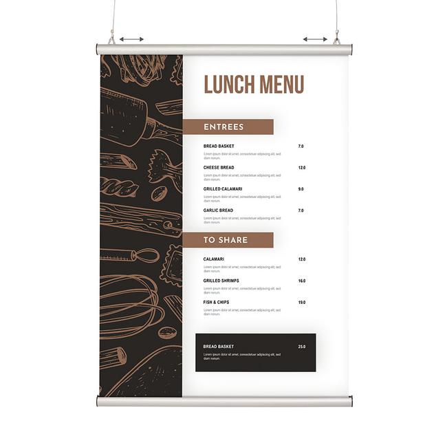 Zur einfachen Wand- und Deckenmontage ist die Oberleiste mit zwei verschiebbaren, grauen Kunststoffaufhängungen ausgestattet, die sich auf Wunsch auch entfernen lassen. Die mitgelieferte Unterleiste dient als Beschwerung des Posters. Die Moosgummi-Einlagen in beiden Leisten sorgen dafür, dass die Plakate nicht verrutschen und so ordentlich und faltenfrei abgehängt werden können. So werden Ihre Werbemedien immer professionell und ansprechend in Szene gesetzt.