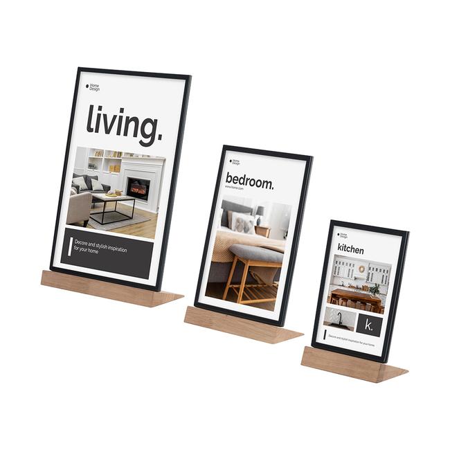 Der Plakat-Tischständer „Kuadru“ ist ein unverzichtbarer Werbeträger zur Präsentation von Angeboten und Informationen. Platzieren Sie den eleganten Aufsteller aus Metall und Holz auf Aktionstischen, Verkaufstheken oder in Schaufenstern. Der Tischständer verfügt über einen keilförmigen Fuß, der für Stabilität sorgt.
