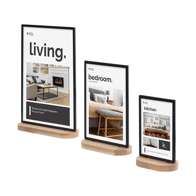 Der Plakat-Tischständer „Kudera“ ist ein eleganter Werbeträger zur Präsentation von Angeboten und Informationen. Platzieren Sie den Aufsteller aus Metall und Holz auf Aktionstischen, Verkaufstheken oder in Schaufenstern. Der Tischständer verfügt über eine stabile ovale Fußform, die für Standfestigkeit sorgt.