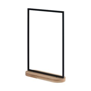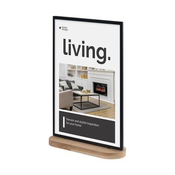 Der Plakat-Tischständer „Kudera“ ist ein eleganter Werbeträger zur Präsentation von Angeboten und Informationen. Platzieren Sie den Aufsteller aus Metall und Holz auf Aktionstischen, Verkaufstheken oder in Schaufenstern. Der Tischständer verfügt über eine stabile ovale Fußform, die für Standfestigkeit sorgt.