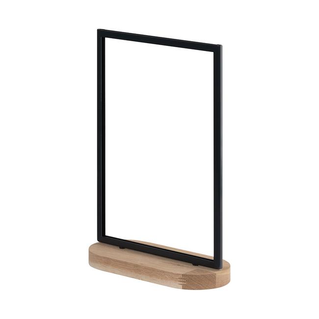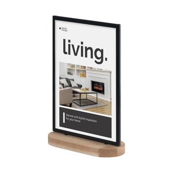 Der Plakat-Tischständer „Kudera“ ist ein eleganter Werbeträger zur Präsentation von Angeboten und Informationen. Platzieren Sie den Aufsteller aus Metall und Holz auf Aktionstischen, Verkaufstheken oder in Schaufenstern. Der Tischständer verfügt über eine stabile ovale Fußform, die für Standfestigkeit sorgt.