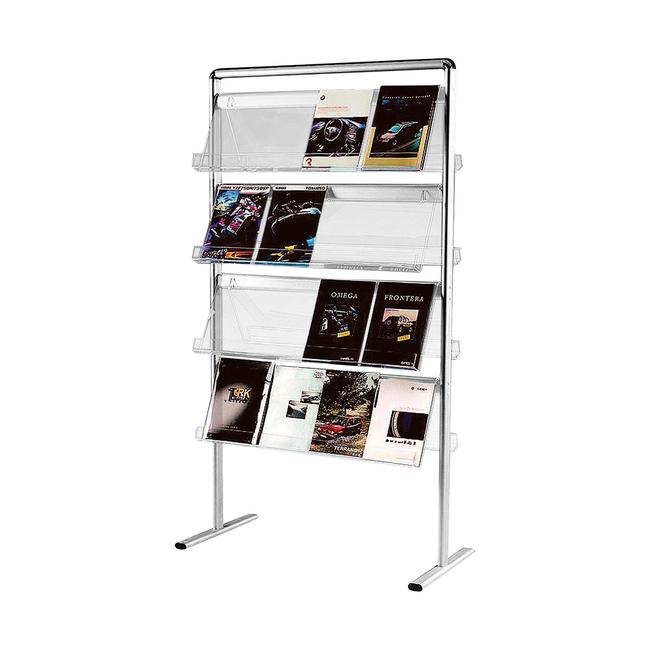 Die 4 einfach einzuhängenden Ablagen aus Acrylglas bieten mit ihrer Fülltiefe von 40 mm genug Stauraum für Ihre Prospekte im DIN A4 Hochformat. Wählen Sie zwischen einer einseitigen oder doppelseitigen Präsentation und 2 verschiedenen Breiten.