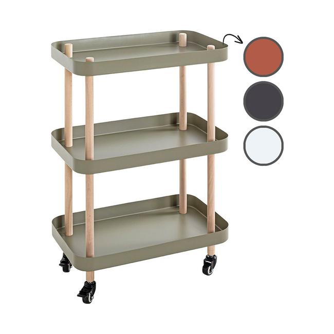 Mit seinen drei stabilen Ebenen bietet er ausreichend Platz für Küchenutensilien, Vorräte oder Dekorationsobjekte. Gleichzeitig eignet er sich hervorragend zur übersichtlichen Aufbewahrung von Bastelmaterialien wie Farben, Werkzeugen oder kleinen Zubehörteilen. Dank der erhöhten Ablagenkanten bleiben auch kleinere Gegenstände sicher an ihrem Platz.