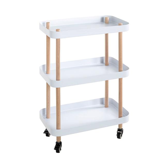 Mit seinen drei stabilen Ebenen bietet er ausreichend Platz für Küchenutensilien, Vorräte oder Dekorationsobjekte. Gleichzeitig eignet er sich hervorragend zur übersichtlichen Aufbewahrung von Bastelmaterialien wie Farben, Werkzeugen oder kleinen Zubehörteilen. Dank der erhöhten Ablagenkanten bleiben auch kleinere Gegenstände sicher an ihrem Platz.