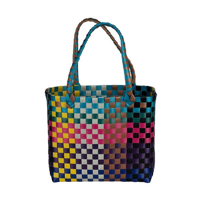 Die bunt gemischten Kunststoffstreifen sind so verflochten, dass ein stabiler Shopper mit hoher Qualität entsteht und dazu noch stylisch aussieht.