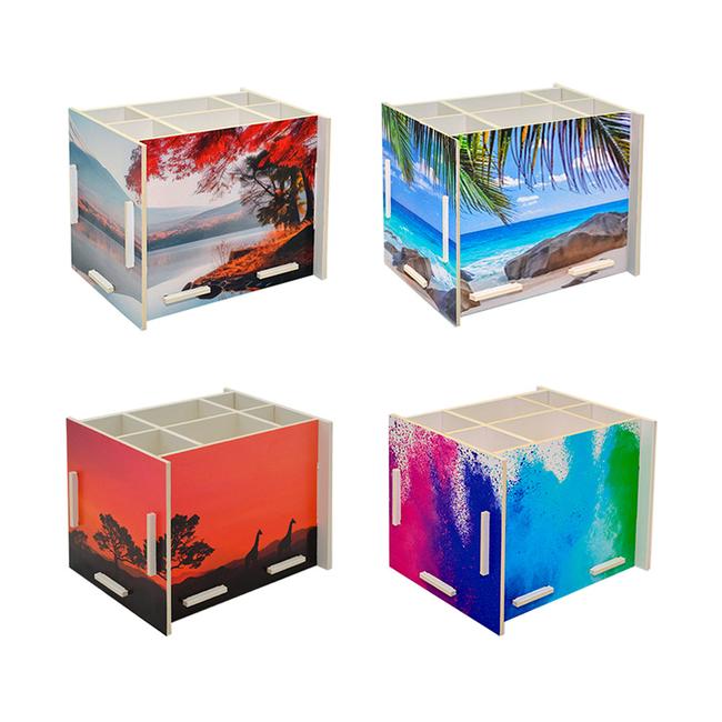 Die Stifteköcher sind auf allen 4 Seiten mit einem hochwertigen Premium-Druck versehen. Die tollen Motive erinnern an Urlaub und laden regelrecht zum träumen ein - goldener Sandstrand mit türkisfarbenem Meer, Sonnenuntergang in der afrikanischen Savanne oder ein klarer Bergsee in den Alpen. Mit diesen bedruckten Stiftehaltern fällt das Arbeiten gleich viel leichter. Besonders beliebt bei Kids und Jugendlichen sind die Stifteköcher im bunten Graffiti-Design mit einer kräftigen Farbbrillianz.