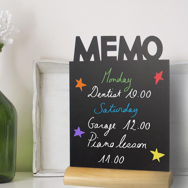 Der Sockel aus Holz bietet einen sicheren Stand und gibt der beschreibbaren Tafel einen natürlichen Look. Zu den Tisch-Kreidetafeln wird ein weißer Kreidemarker geliefert, der sich immer wieder von der schwarzen Tafel abwischen lässt. So können Sie die Tischtafeln auf Wunsch täglich neu beschreiben.