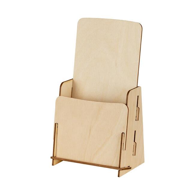 Der Prospektständer wird komplett aus Sperrholz gefertigt. Die einzelnen Teile können schnell, einfach und ohne Werkzeug zusammen gesteckt werden. Bei Bedarf können Sie den Prospekthalter wieder zerlegen und platzsparend lagern.