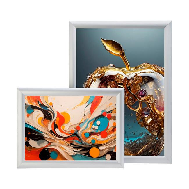 Die silbernen ALU-Klapprahmen im Vorteilspack (5 oder 10 Stück) sind die perfekte Lösung für eine stilvolle und flexible Präsentation von Postern, Bildern, Fotos oder Zeichnungen im DIN A3- oder DIN A4- Format. Mit ihrem hochwertigen, silber eloxierten Aluminium-Profil und einer Rahmenbreite von 25 mm fügen sich die Klapprahmen elegant in jede Umgebung ein, sei es im Büro, im Laden oder in Ihrem Zuhause.Dank der praktischen Klappmechanik können Sie Inhalte mühelos austauschen: einfach den Rahmen aufklappen, das gewünschte Motiv einlegen und wieder zuklappen – fertig!